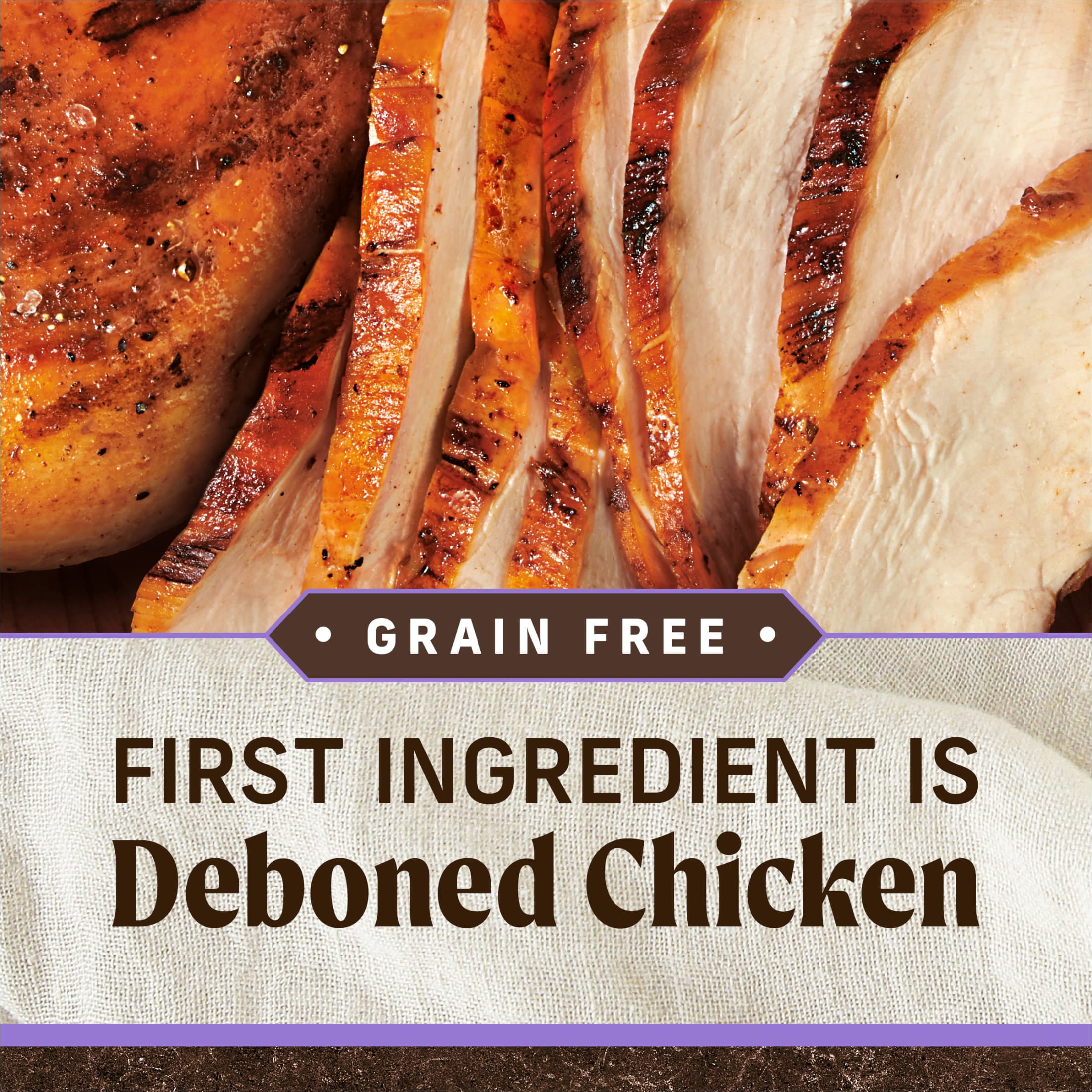 - Real deboned chicken is always the first ingredient in this grain free dry dog food with 60% protein and healthy fat ingredients and 40% produce, fiber, vitamins, minerals and other natural ingredients